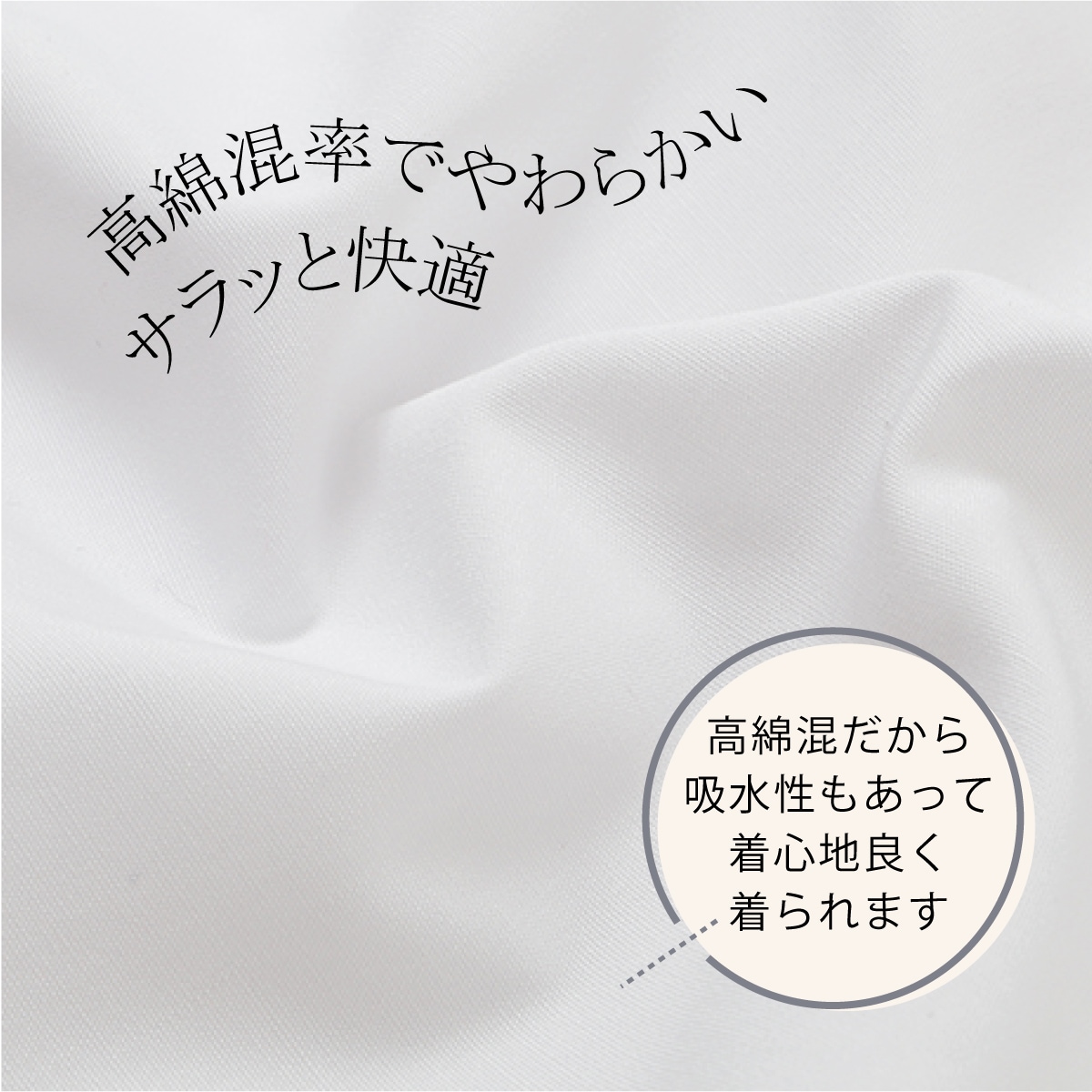 ■ノーアイロンなのに綿混率の素材を使用しているので肌触りもよく、ふっくらソフトな着心地。綿混率も高く、吸湿性にも優れています。