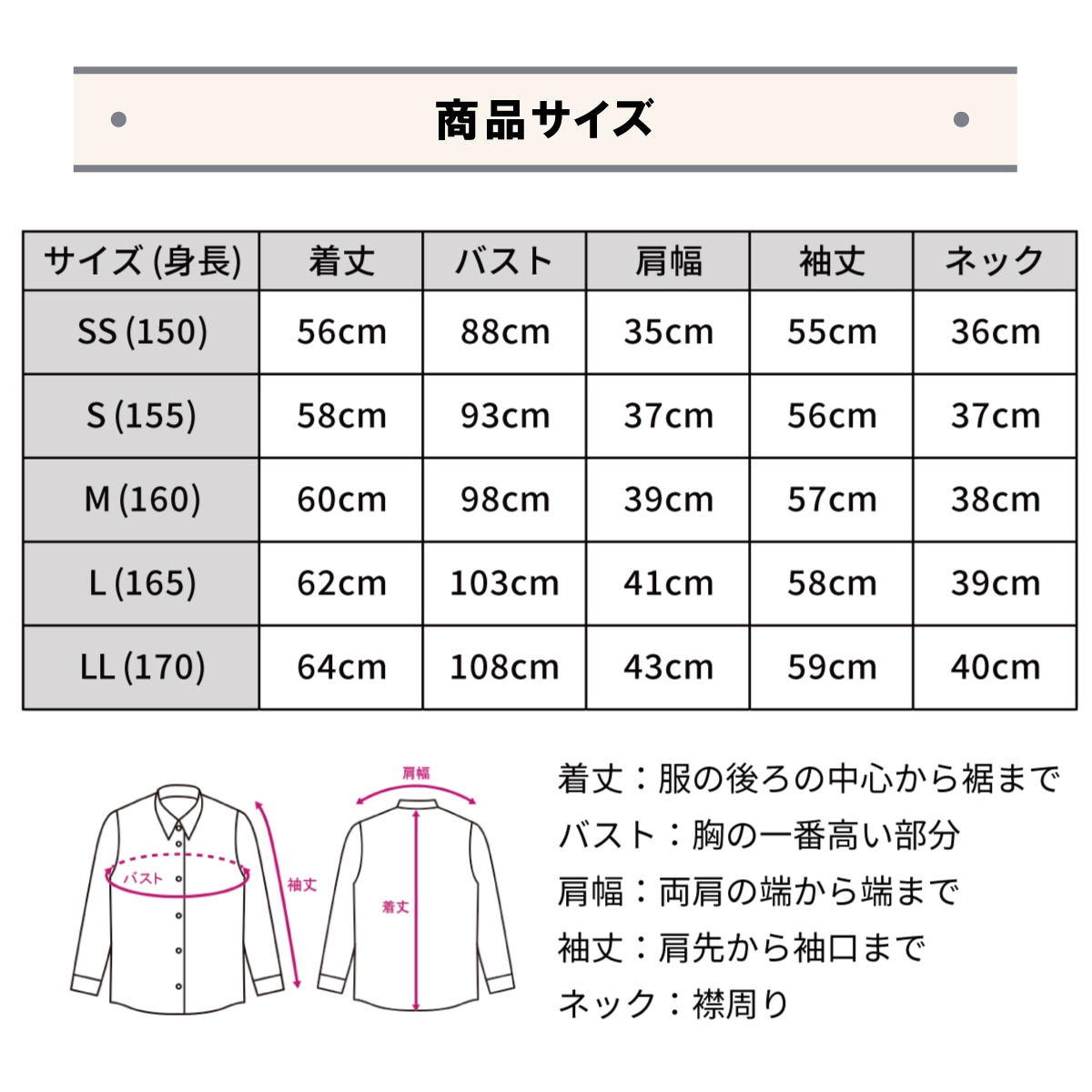 サイズ:SS(150),S(155),M(160),L(165),LL(170)