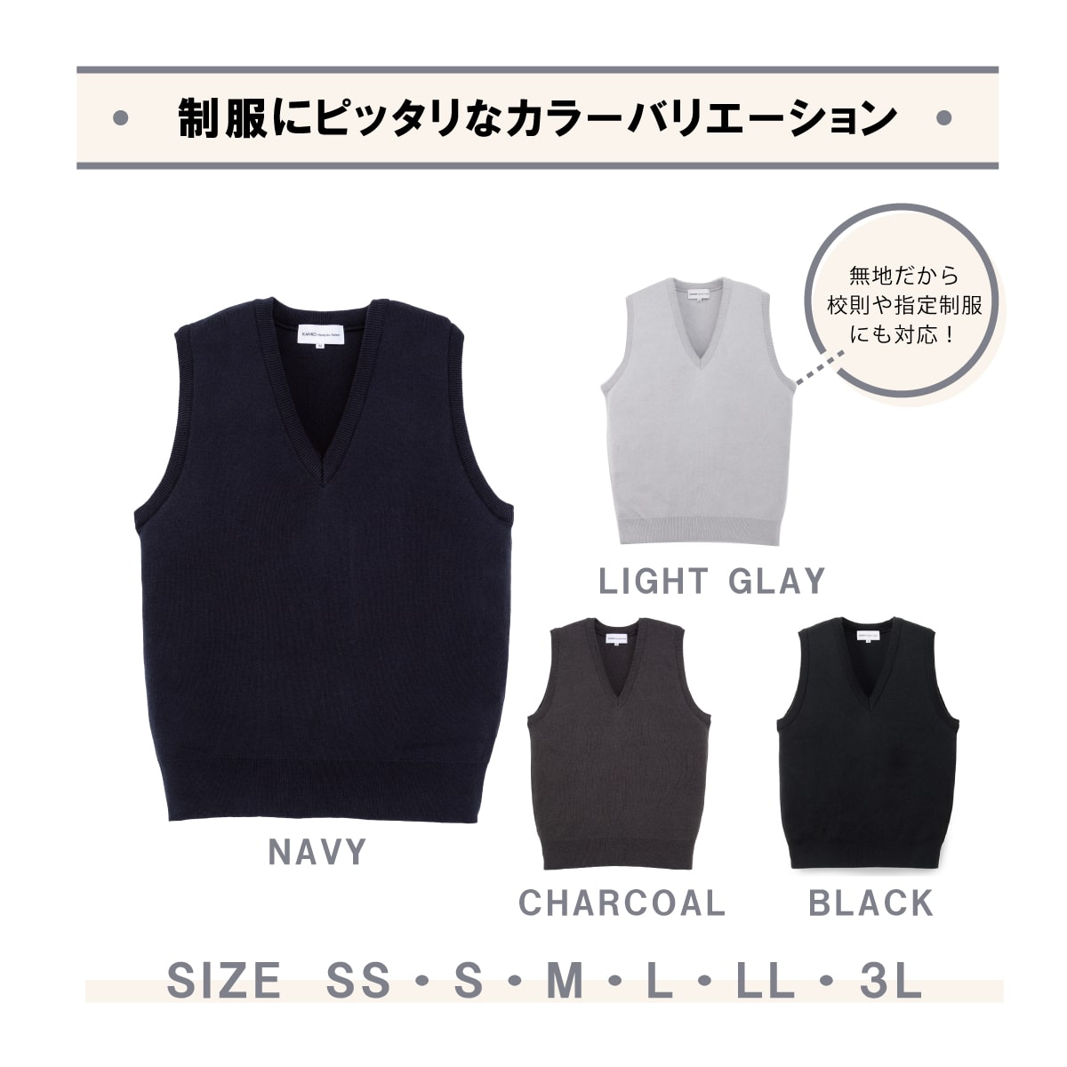 ・制服に合わせやすいシルエットを追求しました。Vネックはちょうどよい開き具合で、リボン・ネクタイどちらも合わせやすいです。程よいゆとりなので、ブレザーと重ね着してももたつかずすっきりと着ることができます。着丈は長すぎないので、ブレザーの下からのぞかず制服らしいきちんとした着こなしができます。