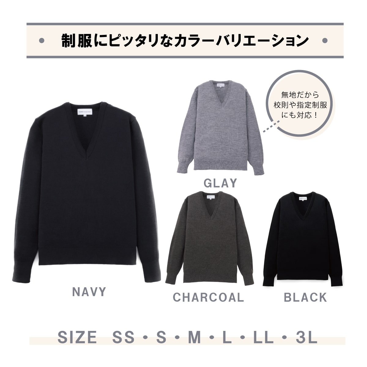 ・制服に合わせやすいシルエットを追求しました。Vネックはちょうどよい開き具合で、リボン・ネクタイどちらも合わせやすいです。程よいゆとりなので、ブレザーと重ね着してももたつかずすっきりと着ることができます。着丈は長すぎないので、ブレザーの下からのぞかず制服らしいきちんとした着こなしができます。