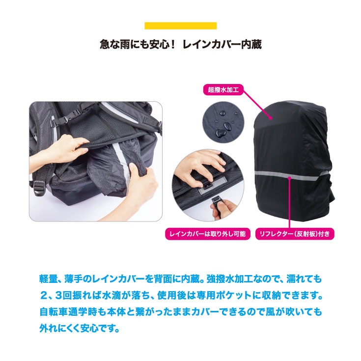 内蔵型レインカバー収納ポケット:突然の雨でも安心のレインカバーを背面下部に内蔵。使用後はサッとふき取り、クルっと収納します。(取外し可)