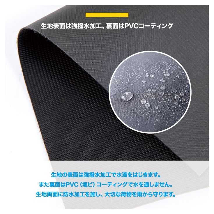 生地裏面にはPVC(塩ビ)コーティングを施し雨などによる水の侵入を防ぎます。内側生地も裏面にポリウレタンコーティング済み。