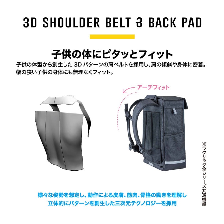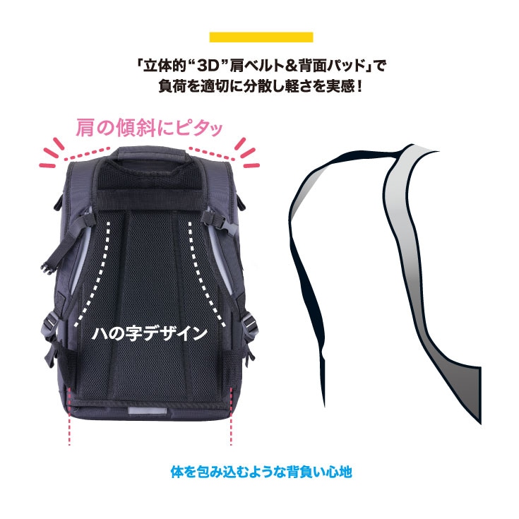 様々な姿勢を想定し、動作による皮膚、筋肉、骨格の動きを理解し立体的にパターンを創生した三次元テクノロジーを採用しています。体に沿ってバッグが背中に密着するので、バッグが上下に揺れることを最小限に抑えます。肩の高い位置に合わせて背負うことで荷物がグンと軽く感じられます。
