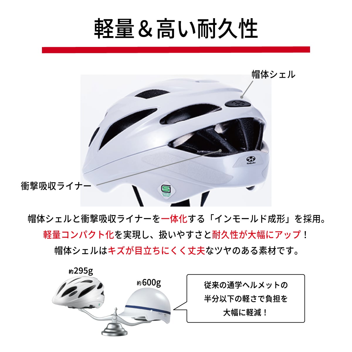 ●帽体シェルと衝撃吸収ライナーを一体化する「インモールド成形」を採用。軽量コンパクト化を実現し、扱いやすさと耐久性が大幅にアップしました。旧タイプのヘルメット(600g)の半分以下(270~295g)の重さで首への負担を軽減!長距離の自転車通学にも最適です。